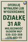 Oferuję dzierżawę lub wynajem działki o powierzchni 31ar m.Glogów Młp ul.Sosnowa ok.1,5 km od rynku centrum , bezpośredni wjazd na drogę powiatową .