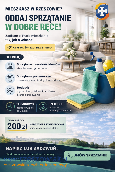 Oferuję sprzątanie mieszkań i domów. Zapraszam do kontaktu przez Facebook - Czysty Rzeszów
