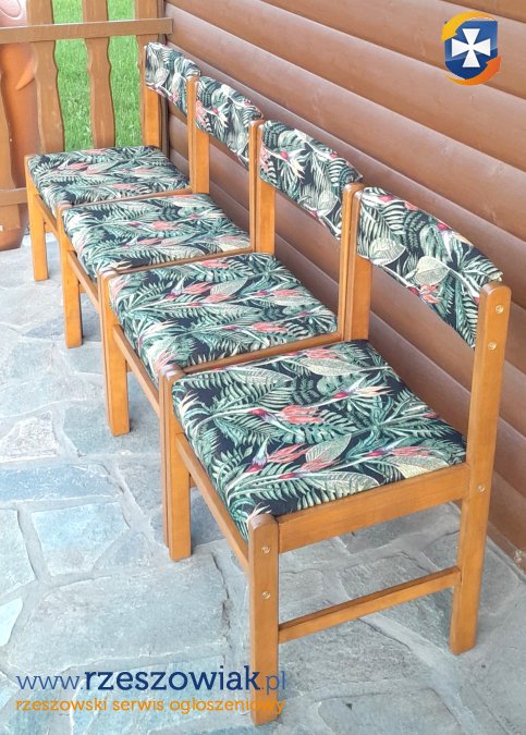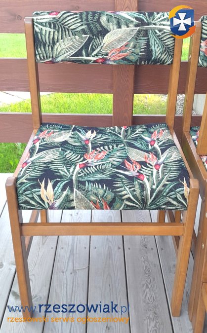 Oferuję świeżo odnowione krzesła. Otrzymały nową, grubą tkaninę żakardową oraz lakier na drewnianych częściach. Posiadają szerokie, wygodne siedziska.