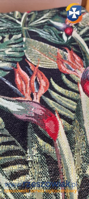 Oferuję świeżo odnowione krzesła. Otrzymały nową, grubą tkaninę żakardową oraz lakier na drewnianych częściach. Posiadają szerokie, wygodne siedziska.