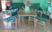 Oferuję świeżo odnowione krzesła. Otrzymały nową, grubą tkaninę żakardową oraz lakier na drewnianych częściach. Posiadają szerokie, wygodne siedziska.