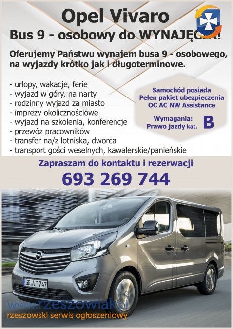 Oferuję wynajem busa 9-osobowego Opla Vivaro wersja Long. Samochód posiada OC, AC, NNW i Assistance na Polskę i Europę.