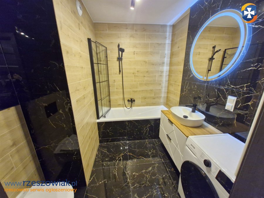 - łazienka wyposażona wannę oraz pralko-suszarkę