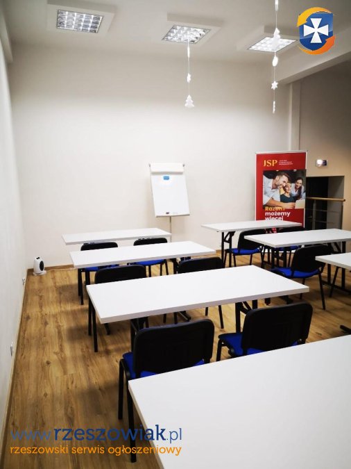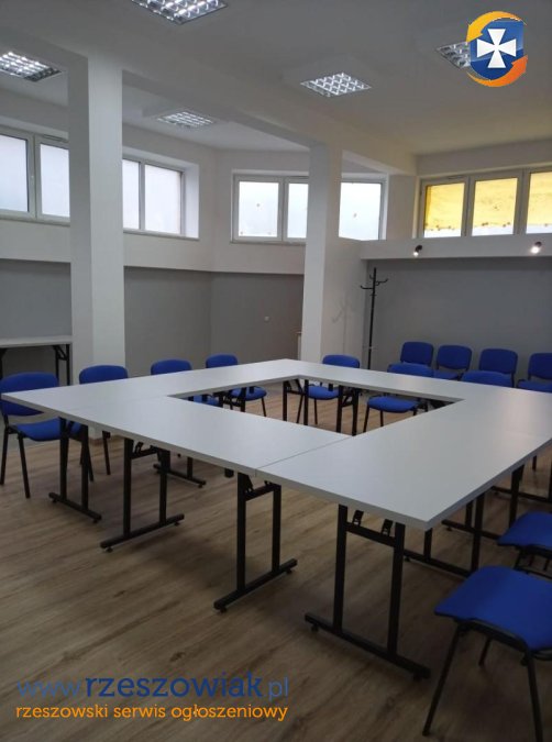 Wyposażenie sali: 24 wygodne krzesła, 8 stolików, aneks kuchenny wyposażony m.in. w kuchenkę mikrofalową, kuchnię/płytę indukcyjną, czajnik, filiżanki i talerzyki.