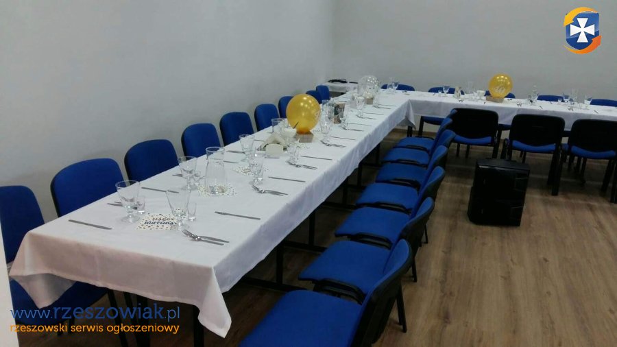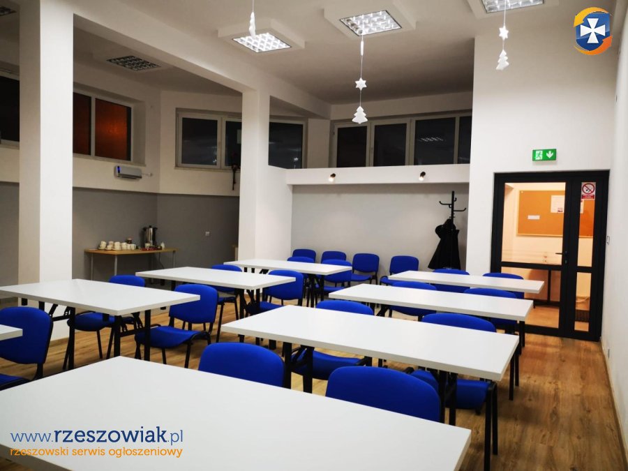 Wyposażenie sali: 24 wygodne krzesła, 8 stolików, aneks kuchenny wyposażony m.in. w kuchenkę mikrofalową, kuchnię/płytę indukcyjną, czajnik, filiżanki i talerzyki.