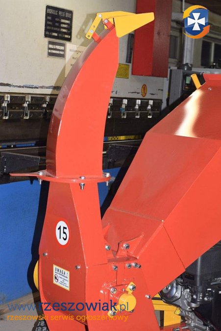 Wyrzutnik zrębki jest przymocowany do korpusu rębaka na zawiasach co ułatwia codzienny serwis maszyny tj. czyszczenie , wymiana noży .