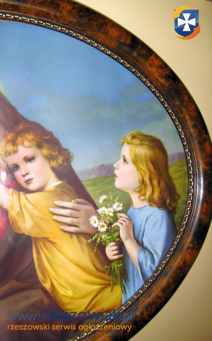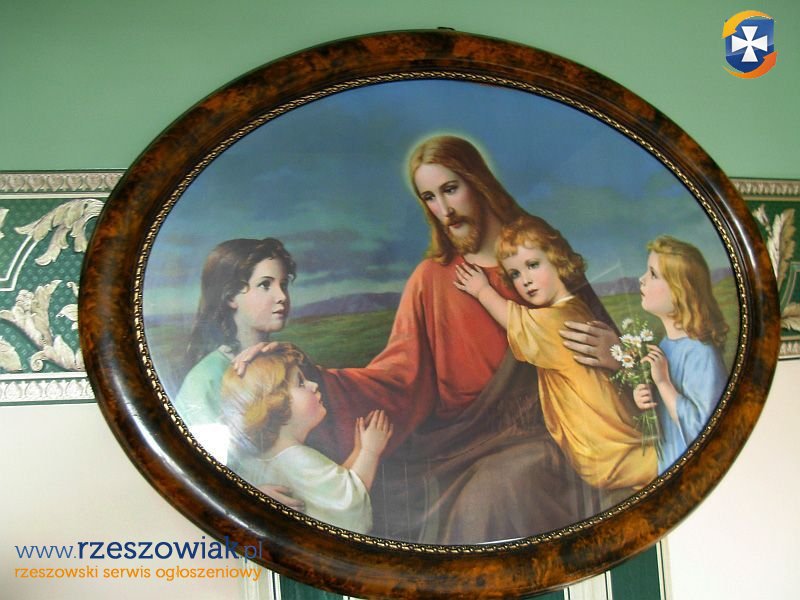 Owalna antyczna rama po środku dekorowany rant,drewniana ciężka. - Pan Jezus w towarzystwie dzieci.Szer.90 x 70 cm.powojenny używany stan -bdb.