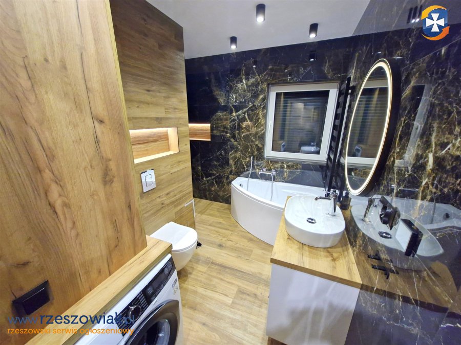 - łazienka wyposażona w prysznic, wannę oraz pralkę