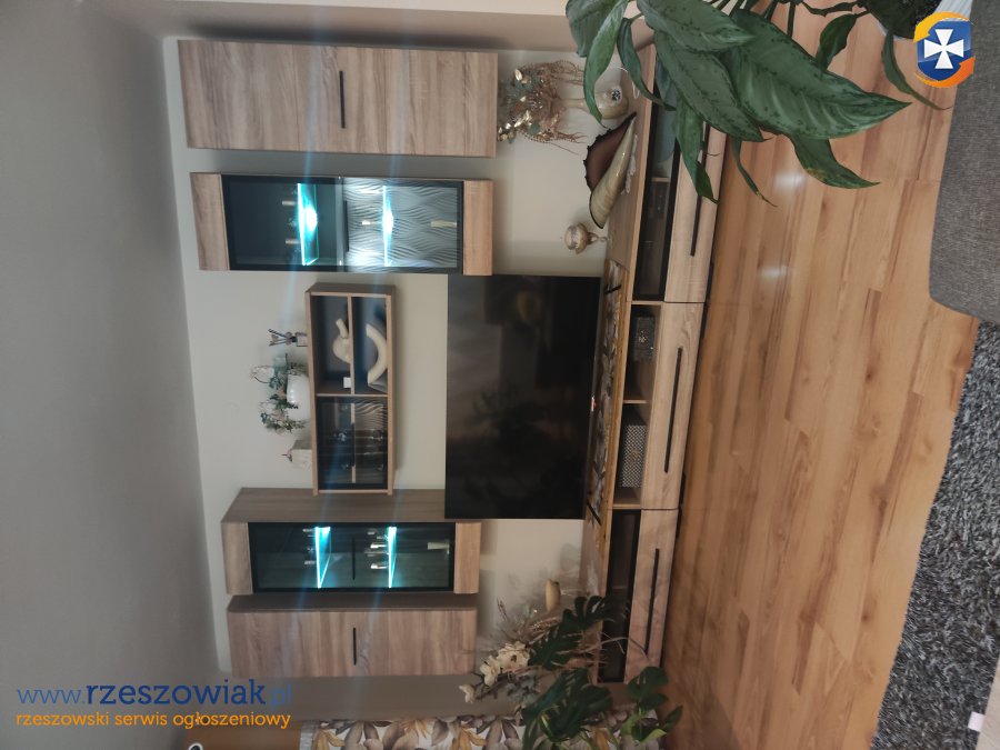 Podświetlane meble do salonu razem z ławą w kolorze dąb sonoma.Długość dolnych szafek 3 m, ława o wymiarach 60/100 cm,wewnątrz ławy półka. Meble w bardzo dobrym stanie.