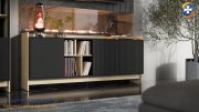 Czarne frezowane meble do salonu w połączeniu z dębem Cremona to stylowe i nowoczesne rozwiązanie. Frezowane fronty dodają meblom elegancji i unikalnego charakteru, natomiast połączenie z ciepłym odcieniem dębu Cremona nadaje wnętrzu przytulności i naturalnego wyglądu. Takie meble idealnie pasują do nowoczesnych wnętrz.