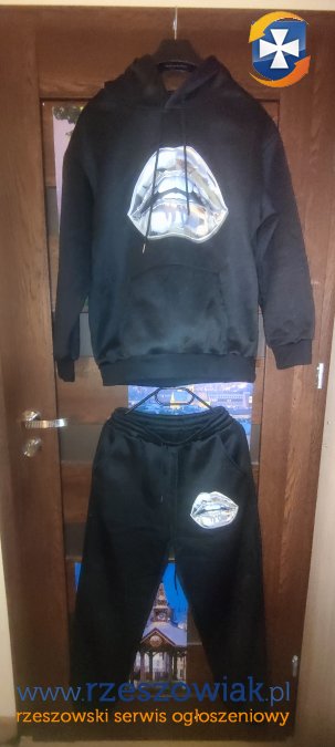 Posiadam w sprzedaży komplet dresowy w kolorze czarnym, składający się z bluzy z kapturem, oraz spodnie dresowe. Komplet posiada widoczne logo - rozchylone usta. Rozmiar dresu to M , ale na wszelki wypadek podaję wymiary :