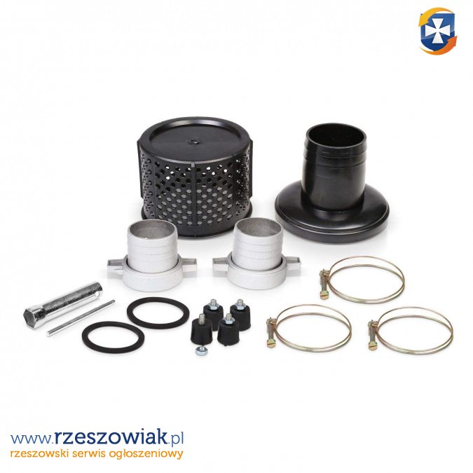W zestawie do motopompy znajduje się komplet przyłączy do mocowania węża, opaski zaciskowe oraz filtr ssawny.