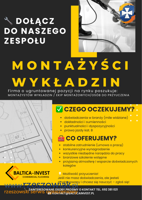 Poszukujemy do naszego zespołu Montera Pokryć Podłogowych. Jeśli masz doświadczenie w montażu wykładzin, paneli czy innych podłóg ,zapraszamy do aplikowania!