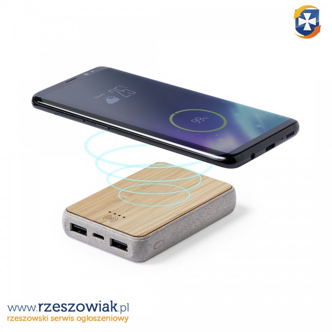 Power bank 5000 mAh z bambusa i plastiku ze słomy pszenicznej z ładowarką indukcyjną (5W) Z dwoma portami USB. Może być ładowany przez port USB-C.