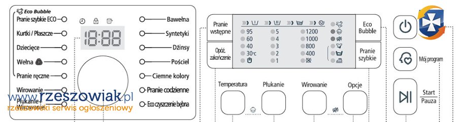 Programy: Bawełna, Syntetyki, Dżinsy, Wełna, Pościel, Ciemne kolory, Pranie codzienne, Eco czyszczenie bębna, Pranie szybkie ECO, Kurtki/Płaszcze, Dziecięce, Pranie ręczne, Wirowanie, Płukanie + Wirowanie