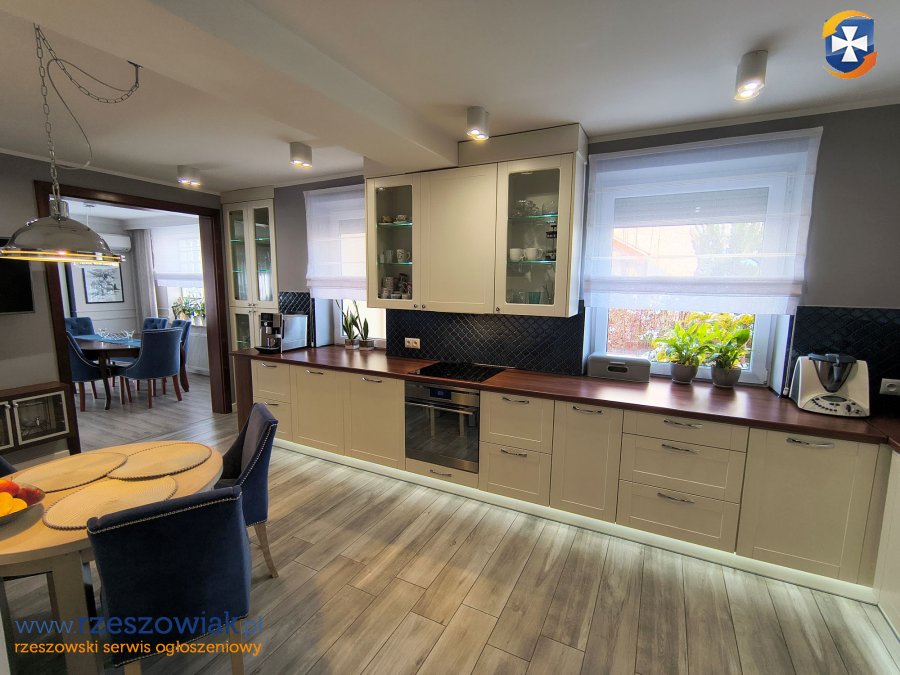 Budynek mieszkalny 4 lata temu przeszedł kompleksowy remont z wymianą instalacji włącznie, jest wykończony wysokiej klasy materiałami. Okna zabezpieczone roletami zewnętrznymi sterowanymi centralnie i indywidualnie, dodatkowo moskitiery. Ogrzewanie centralne gazowe, piec dwufunkcyjny kondensacyjny Immergas, kominek, klimatyzacja. Wszystkie drzwi wewnętrzne drewniane, wejściowe dębowe. Schody dębowe, stopnie z podświetleniem ledowym. Na podłogach wysokiej klasy panele. Wnętrza pomalowane zmywalnymi farbami Ticurilla. Wiatrołap, kuchnia, salon, łazienki, sypialnie na piętrze z zabudową meblową na wymiar. Kuchnia - okap podszafkowy, piekarnik, płyta indukcyjna, zmywarka 60, lodówka dwudrzwiowa Side by Side LG z kostkarką. Budynek mieszkalny i garaż murowany z pustaka ceramicznego (docieplony), ściany działowe cegła, stropy żelbetonowe docieplane. Garaż docieplony, podłoga płytki, antresola, brama wjazdowa na pilota.