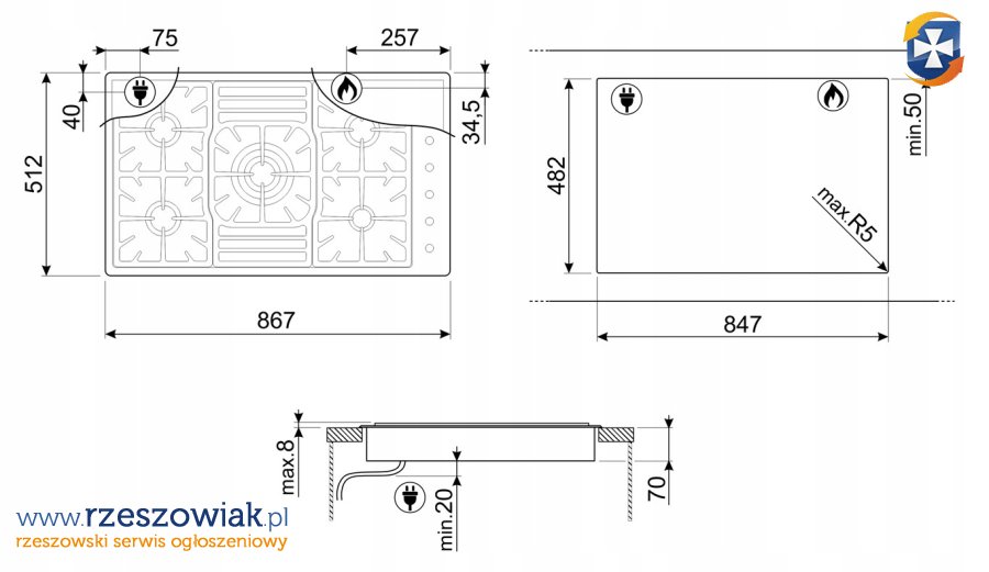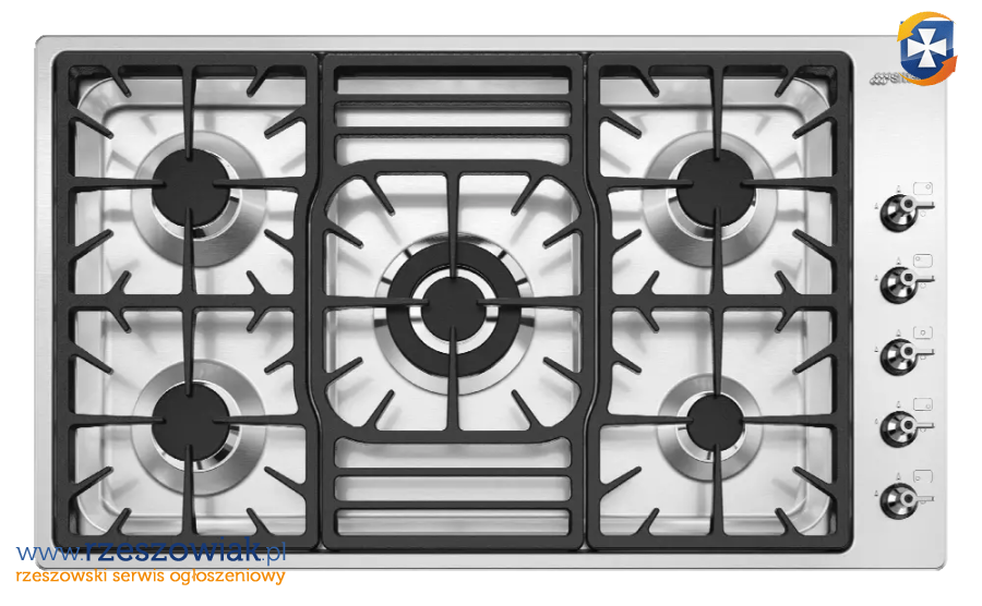 Płyta gazowa 5 - palnikowa, o wymiarach 86.7 x 51.2 cm oraz o mocy całkowitej 10450 W. Wykonana ze stali nierdzewnej, z zapalarką gazu zintegrowaną w pokrętle, zabezpieczeniem przeciwwypływowym gazu oraz z rusztem żeliwnym.