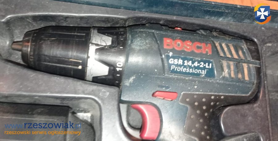 Profesjonalny wiertarko-wkrętarka Bosch GSR 14,4-2-LI z zestawem akcesoriów - 2 akumulatory, ładowarka oraz walizka. Narzędzie jest w stanie używanym, ale w pełni sprawne i gotowe do użytku.