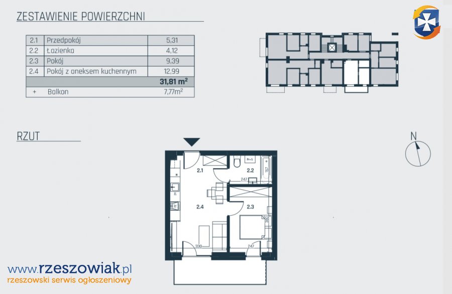 31.81m2- 2 pokoje, balkon o pow. 7.77m2 sprzedane