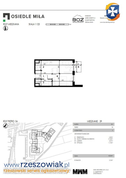 Przedstawiamy 2-pokojowe mieszkanie na czwartym piętrze w inwestycji Strażacka 54G. Mieszkanie o powierzchni 43,24 m2˛ to idealna propozycja dla singla lub pary, która ceni komfort, spokój i przestronność. Mieszkanie składa się z przestronnego salonu z aneksem kuchennym, sypialni, łazienki oraz przedpokoju. Dodatkowo mieszkanie posiada balkon o powierzchni 3,12 m2˛, które zapewnią komfort wypoczynku na świeżym powietrzu.