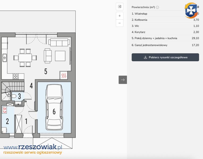 - pokój dzienny + jadalnia + kuchnia 29,10 m2,