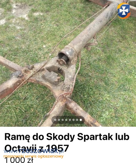 Ramę samochodu Skoda Spartak, Octawia (1957-1962) sprzedam. Rama jak na zdjęciach wraz z wałem oraz zawieszeniem i mostem oraz kołami.