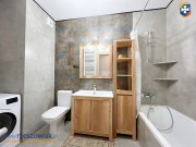 - w łazience: wanna z baterią prysznicową, umywalka z szafką, szafka stojąca, lustro, kompakt wc, pralka,