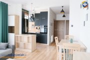 - meble kuchenne z sprzętem AGD (lodówka, piekarnik, płyta indukcyjna, okap), stół, 4 krzesła,