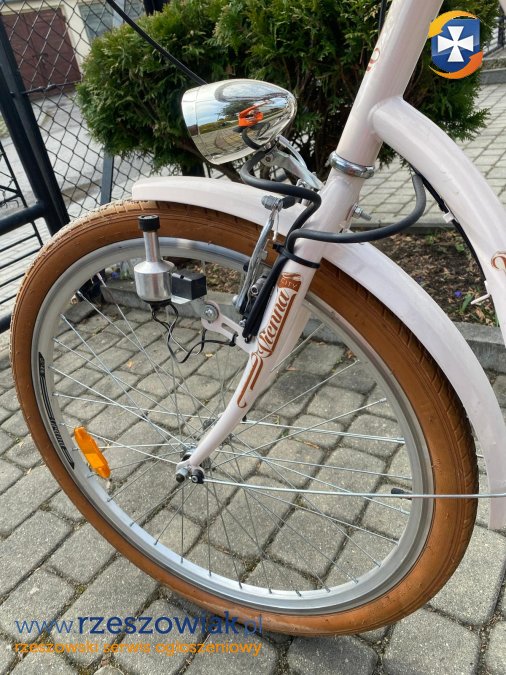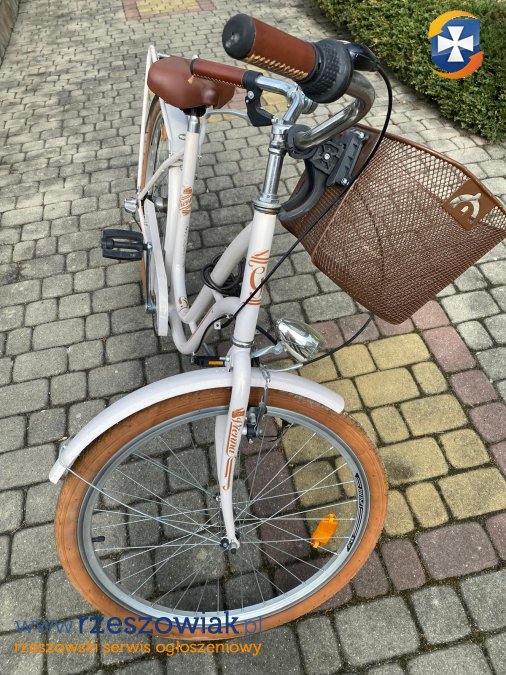 Rower 26 calowych obręczy, tradycyjny damski rower miejski z koszykiem. Napędzany przez 3- biegową przerzutkę.