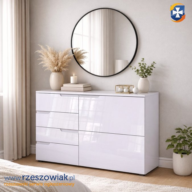 Komoda szufladowa z kolekcji mebli systemowych " SELENE" to połączenie funkcjonalności jaką kryją pojemne szuflady z oryginalnym designem i lekkością jaką nadają fronty w białym wysokim połysku.