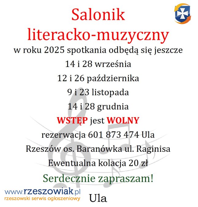 Serdecznie zapraszam do Saloniku literacko-muzycznego co dwa tygodnie w niedziele, do mieszkania na Baranówce na ul.Raginisa, gdzie o godzinie 17.00 zaczynam grać na pianinie kompozycje Chopina, Kilara, Morricone, Sinatry i czytane są moje wiersze. WSTĘP jest WOLNY. Potem kto chce zostaje na kolacji za 20 zł, a po niej gramy sobie w Rummikuba. Nie rozmawiamy o polityce i religii. Niezbędna jest rezerwacja na 601 873 474 - wtedy podaję dokładny adres