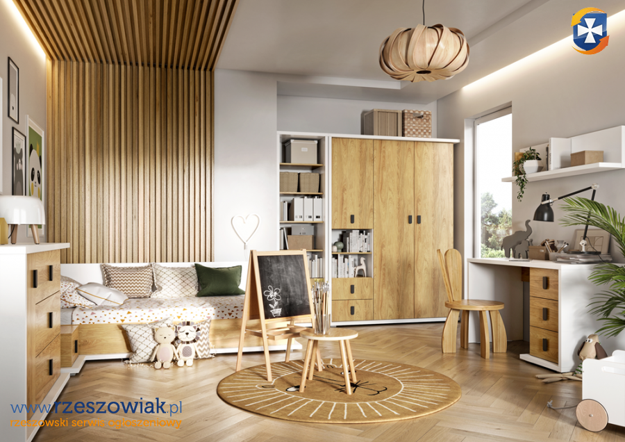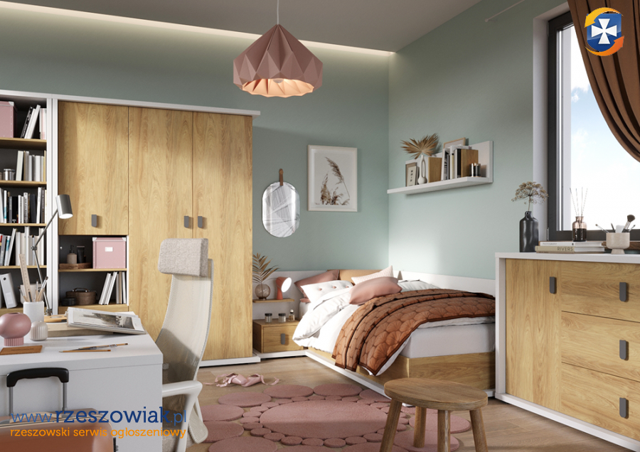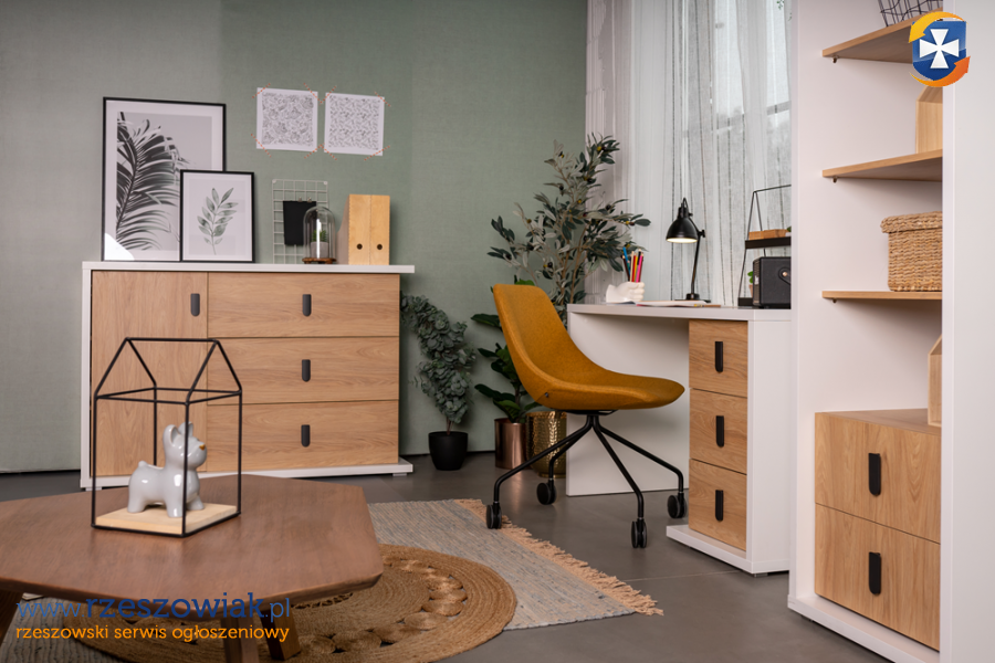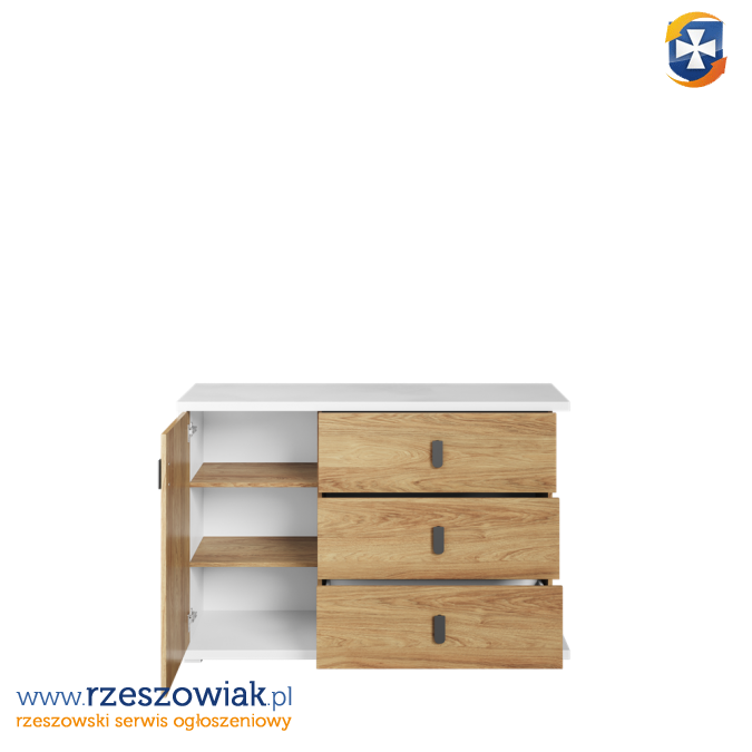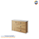 Duża komoda z dobrze przemyślanym układem funkcjonalnym. W zamykanej szafce wygodnie przechowasz odzież lub szkolne akcesoria. Trzy pojemne i łatwo dostępne szuflady to dobre miejsce na bieliznę lub najróżniejsze dokumenty. Styl mebla w ciekawy sposób łączy nowoczesność z nutą tradycji. Ponadczasowe zestawienie bieli i dekoru o ciepłej barwie drewna sprawia, że komoda stworzy przytulną aranżację w każdym wnętrzu. Uwagę zwraca modny, masywny korpus, który jednocześnie wyznacza ramę mebla. Efektowny zabieg stworzyło cofnięcie frontów pod linię korpusu. Mebel wykonano z wytrzymałej płyty laminowanej, wykończonej trwałym obrzeżem ABS.