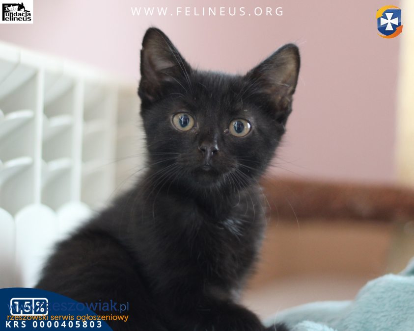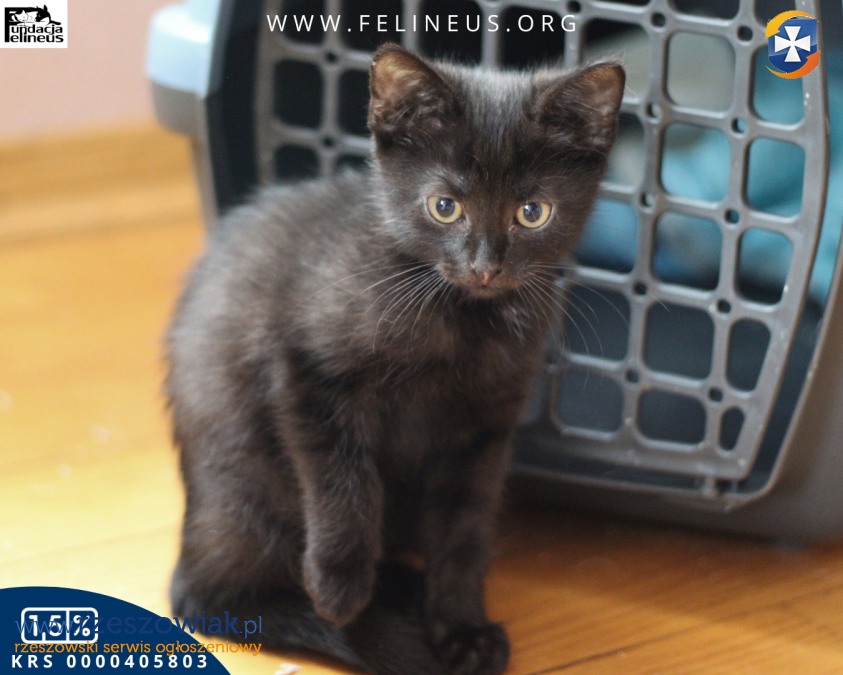 Smolik - kocurek urodzony w lipcu 2025. Smoliś ma obdarty nosek, dlaczego? Ano dlatego, że Smolika jest wszędzie pełno. Jest po prawej, zaraz po lewej, w ułamku sekundy "przelatuje" na drapak, a zaraz potem wbiega na ręce człowieka. Smolik jest po prostu wszędzie. Jest kochanym, słodkim i rozbrykanym kocim maluchem. Chętnie zamieszka w domu z innymi kotami lub zabierze do nowego domu brata lub siostrę.
