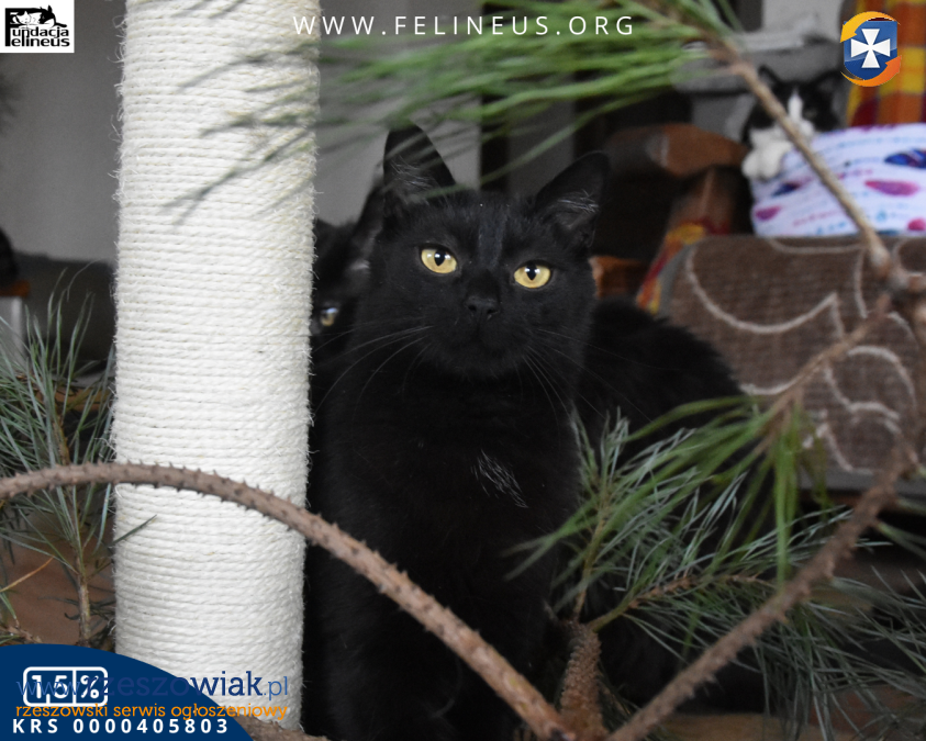 Smoluś - czarny, smukłej budowy kocurek, urodzony jesienią 2022 roku. Smoluś to kot o dużym temperamencie. Potrafi być jednocześnie wszędzie gdzie coś się dzieje. Nie jest typem kota nakolankowego, raczej to typ indywidualisty. Z kotami funkcjonuje dobrze, choć potrafi dominować i być zazdrosnym o względy opiekuna. Nie nadaje się do domu z dziećmi bo jest nieco nieobliczalny. Potrafi podrapać w zabawie, zaczepia nogi, podgryza. To zachowania wynikające z faktu, że zbyt wcześnie został oddzielony od matki.