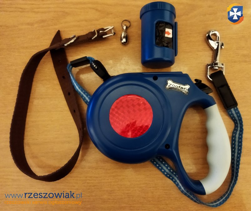 Smycz automatyczna Zoofar 8 m plus dodatki. Nie były używane. Do smyczy można dopiąć pojemnik z woreczkami. Obroża długości 50 cm. Brelok informacyjny/adresówka bez karteczki w środku.