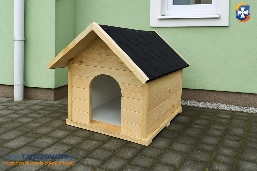 Solidna drewniana buda dla psa średniego z dachem pokrytym gontem bitumicznym.