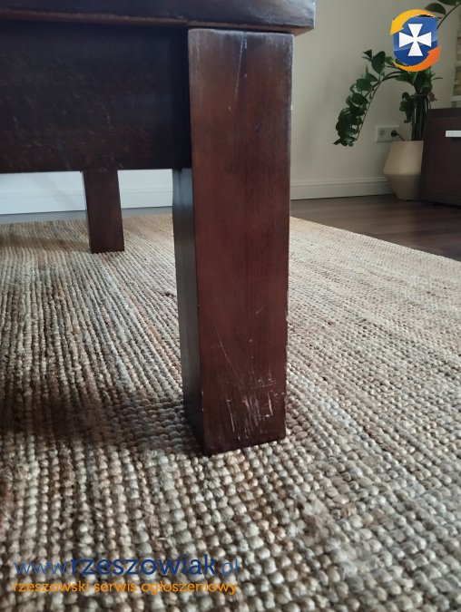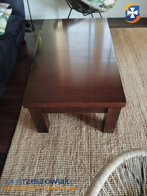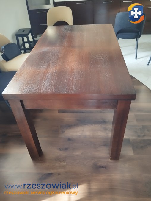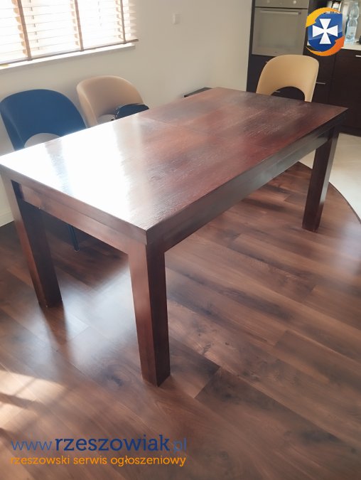 Solidny, drewniany stół z ławą w kolorze ciemnego brązu. Mebel wykonany z wysokiej jakości forniru. Wymiary stołu 160/90, z dostawką na wymiar 200 cm. Ława 65/110 wysokość 43 cm. Stół i ława byly używane, na nogach mają nieliczne zarysowania od krzeseł, które mozna zamaskować korektorem do drewna.Cena za komplet. Odbiór osobisty.