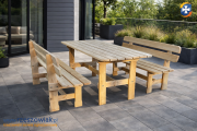 Solidny, drewniany zestaw mebli ogrodowych, idealny do wypoczynku na świeżym powietrzu. Składa się z dużego stołu i dwóch ławek. Wykonany z wysokiej jakości drewna olchowego, zapewnia wytrzymałość i trwałość. Doskonale komponuje się z zielenią ogrodu, tworząc przytulną przestrzeń do relaksu.