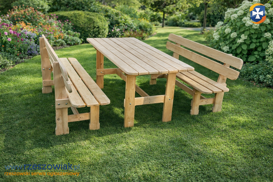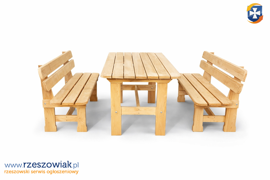 Solidny, drewniany zestaw mebli ogrodowych, idealny do wypoczynku na świeżym powietrzu. Składa się z dużego stołu i dwóch ławek. Wykonany z wysokiej jakości drewna olchowego, zapewnia wytrzymałość i trwałość. Doskonale komponuje się z zielenią ogrodu, tworząc przytulną przestrzeń do relaksu.