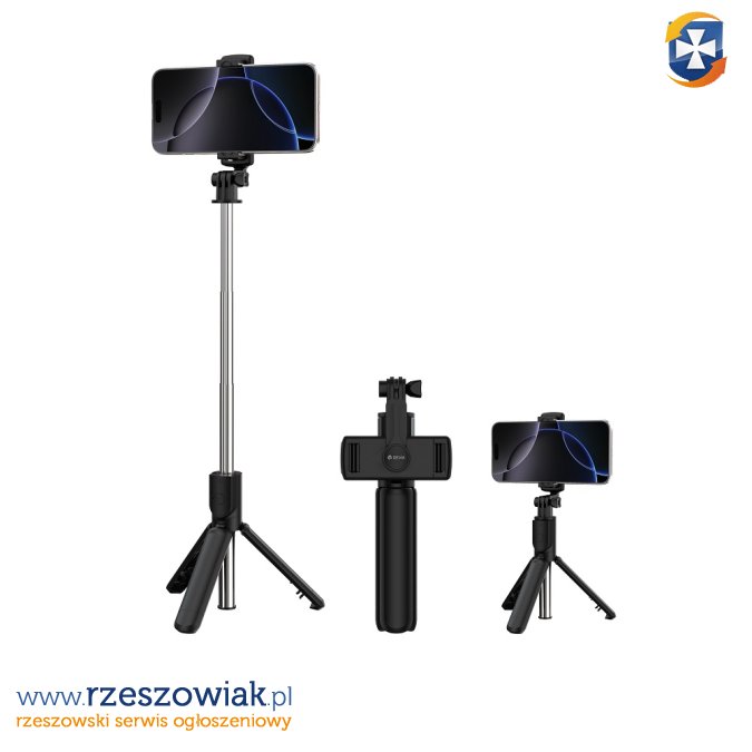 Solidny i estetycznie wykonany selfiestick Devia z komfortowym uchwytem na telefon i wbudowanym tripodem. Telefon można umieścić w pozycji pinowej lub poziomej.