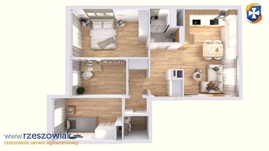 - salon z aneksem kuchennym (otwarta, jasna przestrzeń)