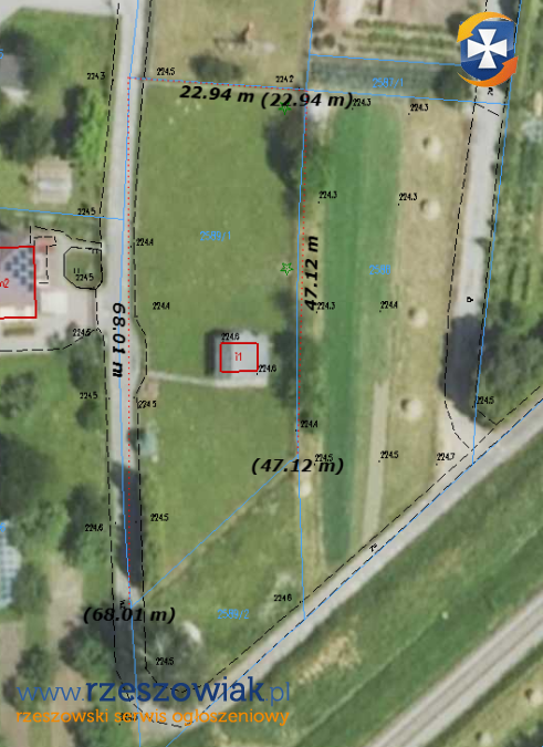 Teren jest płaski ogrodzony, powierzchnia 13 ar , kształt trapezu o wymiarach szerokość 22,5 m x 47 m ( 68 m )