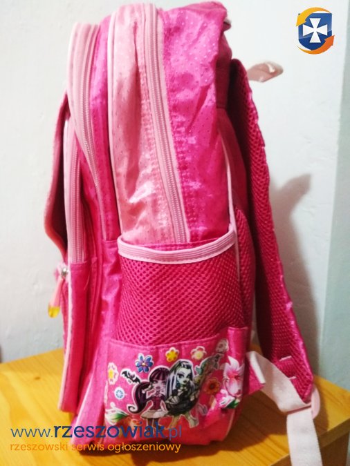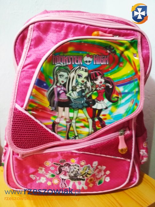 Sprzedam bardzo ładny używany plecak szkolny monster high. Plecak nosi normalne, minimalne ślady użytkowania. Plecak ma trzy komory i dwie kieszonki na przodzie, wszystkie na zamki. Klapa jest zapinana na rzep. Po bokach są kieszonki siateczkowe. Wymiary: szer.32 cm, wys.39 cm, głębokość 16 cm. Do odbioru osobistego w Rzeszowie. Miejsce odbioru do uzgodnienia. Cena 20 zł.