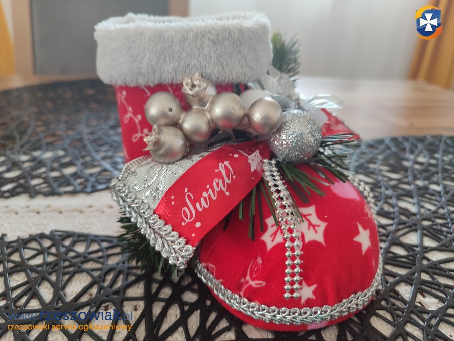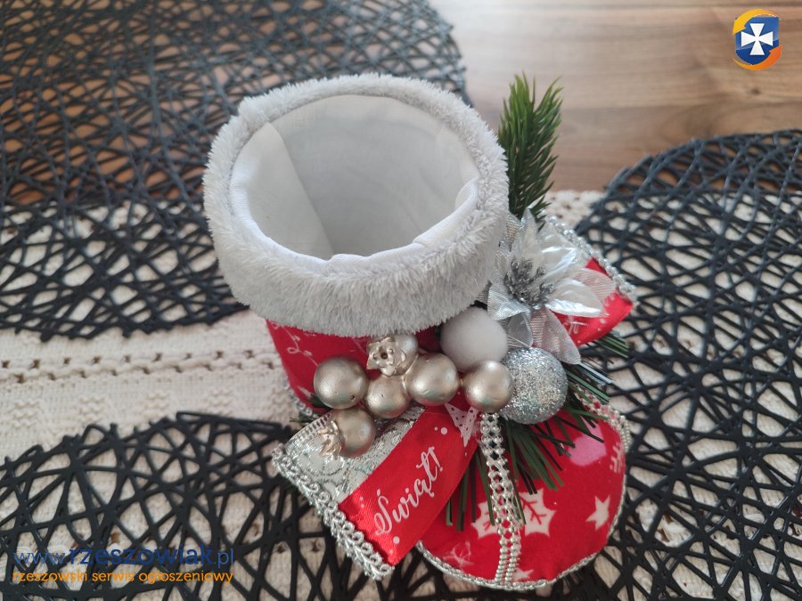 Sprzedam but Świętego Mikołaja. Idealna ozdoba na stół świąteczny. Do buta można włożyć cukierki i dać jako prezent. But w świątecznym czerwonym kolorze wykonany własnoręcznie.