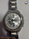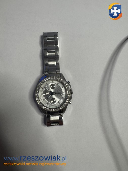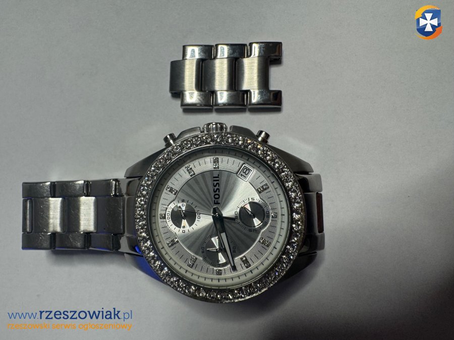 Zegarek w kolorze srebrnym, z funkcją chronografu (stoper), datownikiem i ozdobnym pierścieniem z kryształkami.