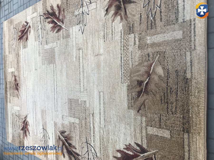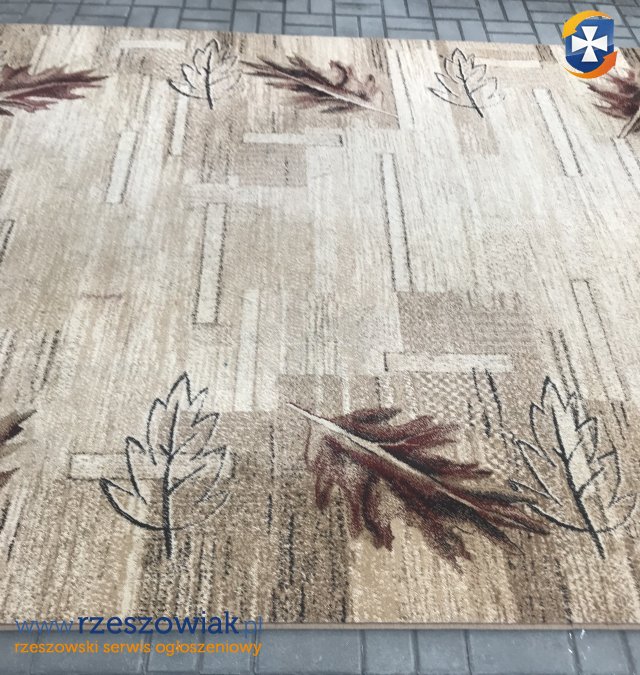 Sprzedam duży dywan w odcieniach beżu i brązu, ozdobiony motywem jesiennych liści. Dywan ma stonowaną, ciepłą kolorystykę. Wzór jest delikatny, a jednocześnie dekoracyjny.