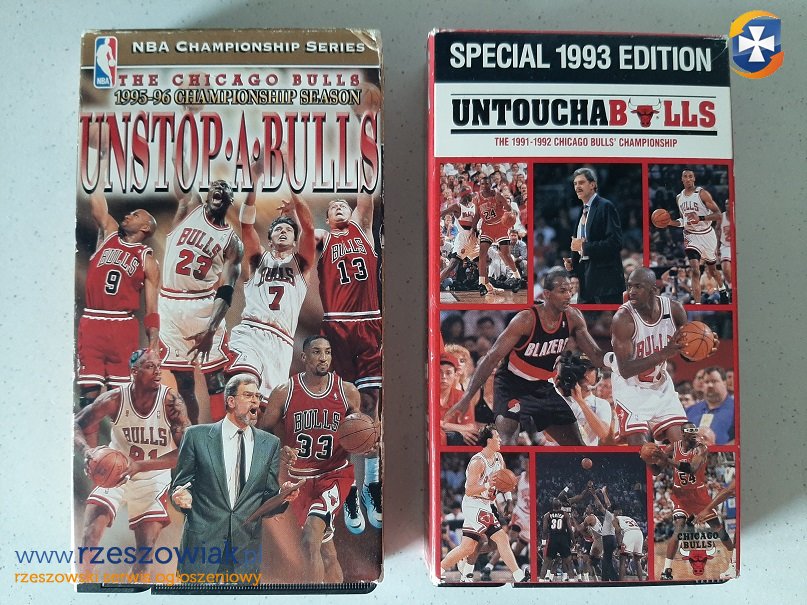 Sprzedam dwie kasety VHS o zespole koszykarskim Chicago Bulls: "UntouchaBulls" (edycja specjalna) i "Unstop-a-Bulls", oryginalne, zakupione w USA, w języku angielskim