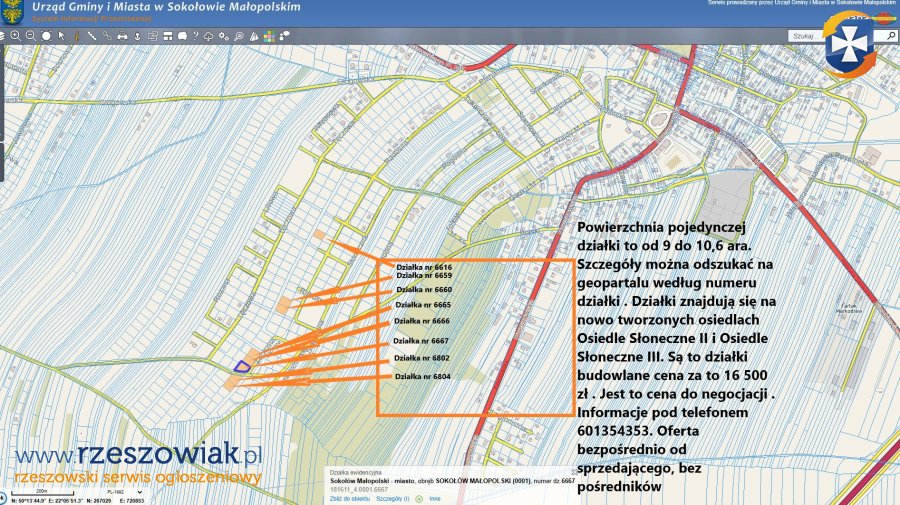 Sprzedam działkę budowlaną w Sokołowie Małopolskim . Super lokalizacja. Działka zlokalizowana jest na Osiedlu Słoneczne II w bardzo spokojnej okolicy. W pobliżu kompleks leśny Turza w odległości 1 km, cisza , spokój żadnych zakładów produkcyjnych w promieniu kilkunastu kilometrów. Dojazd do Rzeszowa S19 w kilkanaście minut. Zapraszam do kupna cena za 1 ar to 16 500 zł do negocjacji. Działkę pod numerem 6667 można odnaleźć na geoportalu. Działka ma powierzchnię 10.58 ara. Posiadam na sprzedaż również działki sąsiadujące z wystawioną działką stąd dla osób zainteresowanych większą powierzchnia istnieje możliwość zakupu sąsiednich działek. Mam również do sprzedaży działki budowlane w innych lokalizacjach w Sokołowie Młp. Serdecznie zapraszam do zakupu.