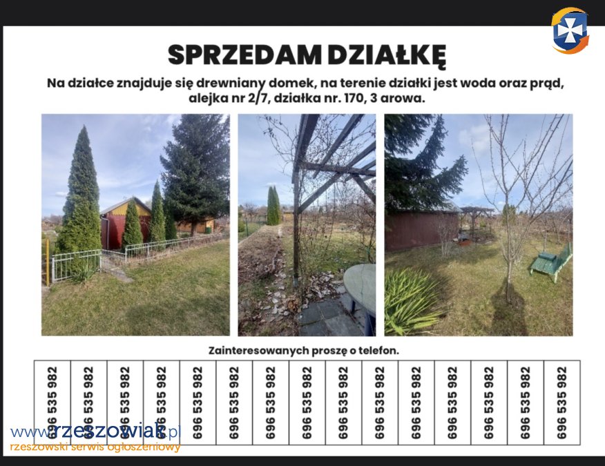 Sprzedam działkę na ogródkach działkowych âPrzyszłośćâ przy ulicy Paderewskiego. Działka ogrodzona, z wodą i prądem. Na działce drewniany domek z komórką na narzędzia oraz z miejscem do wypoczynku. Na działce drzewa owocowe, winogrono, rabaty kwiatowe. Możliwość sadzenia warzyw. Więcej informacji tylko telefonicznie.
