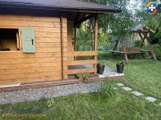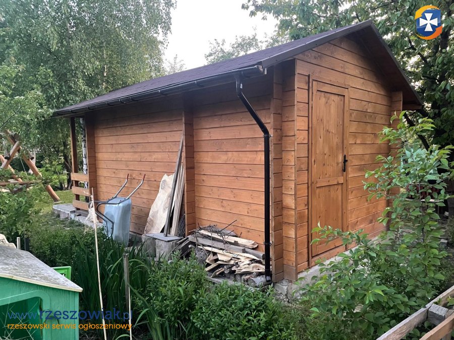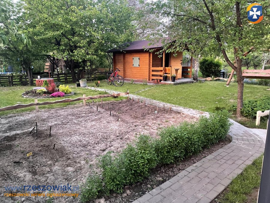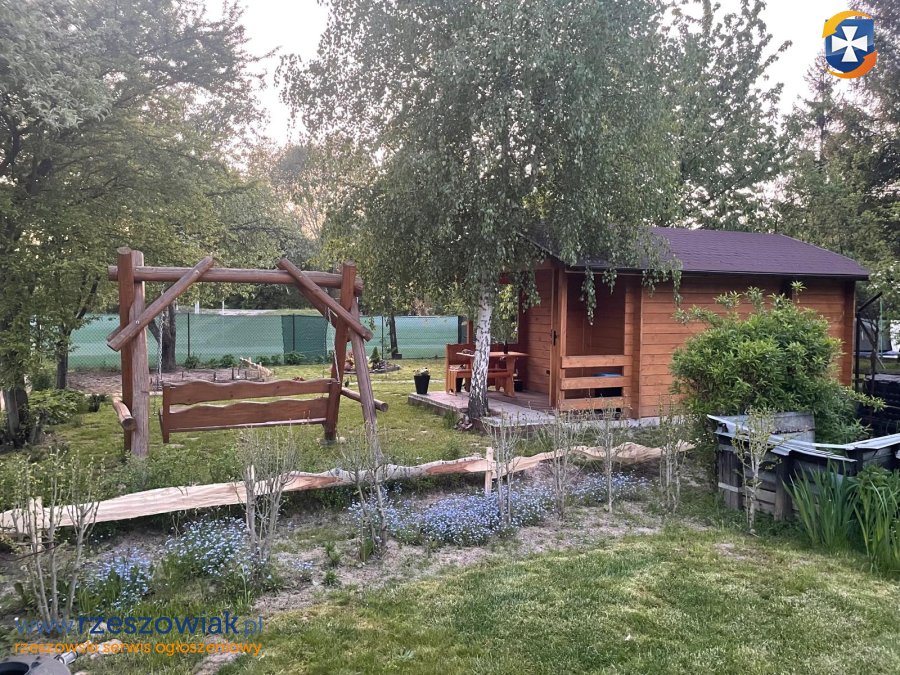 Na działce NOWY domek z tarasem (betonowy fundament, dach pokryty gontem). Domek 9m2 zbudowany z drewna, podłoga drewniana, podzielony na dwa pomieszczenia. Z tyłu osobna część służąca do przechowywania narzędzi. Okno drewniane z okiennicami, pomiędzy dachem a sufitem schowek. W domku doprowadzony prąd.